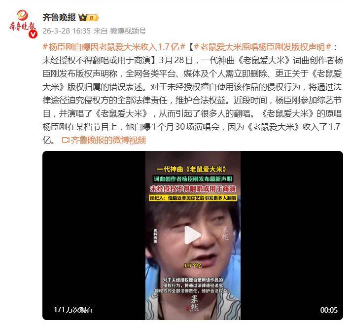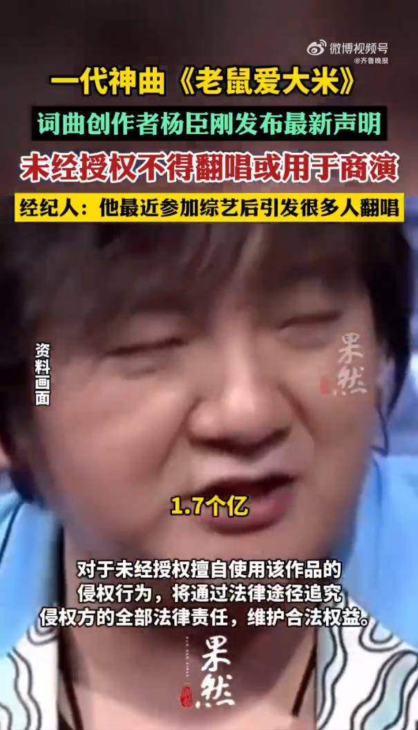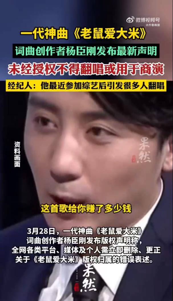 据3月28日报道,网络神曲《老鼠爱大米》的词曲创作者及原唱杨臣刚,突然发布了一则措辞严厉的版权声明,瞬间炸开了锅。声明要求全网平台、媒体和个人立即删除并更正关于这首歌版权归属的错误信息,并放话将用法律手段追究一切侵权责任,一副“我的大米谁也别想乱动”的架势。
