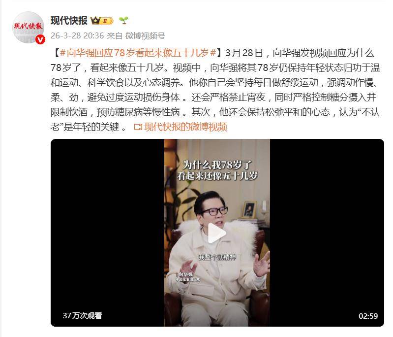 据3月28日报道,78岁的向华强因其看起来宛若五十几岁的年轻状态在网络上引发热议。3月28日,他本人发布视频,亲自回应了公众对其“不老”秘诀的好奇,将保持年轻的关键