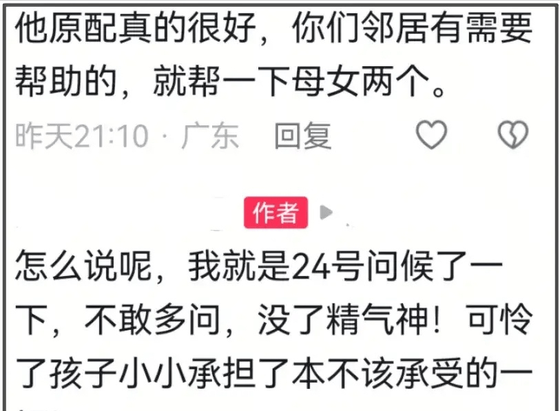 还有网友表示他的原配妻子很好,朋友就是在24号的时候问候了一下,但是不敢多问、感觉整个人没了精气神,尤其是孩子小小年纪承担着不该承受的一切。