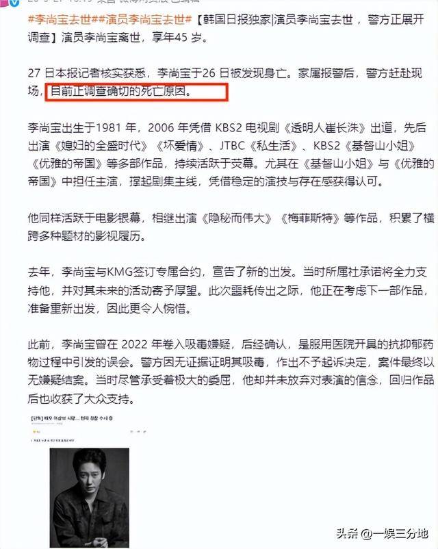 昨天,韩国男星李尚宝突然被传出了在家中去世的消息。