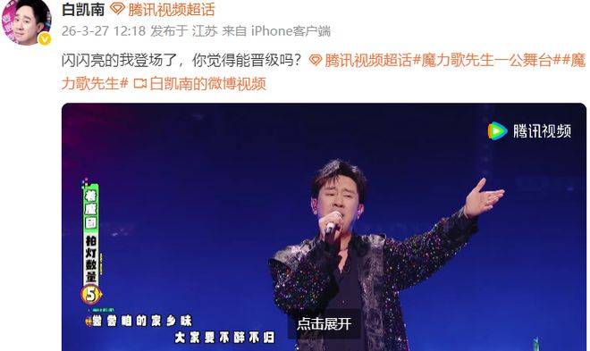 白凯南演绎的《忐忑》简直太棒了!连原唱龚琳娜都惊讶不已,真是难以想象的精彩! 2026年3月27日中午12:18,著名喜剧艺术家白凯南在自己的社交平台上发布了一条动态:闪闪亮的我登场了,你觉得能晋级吗?这个简单却充满自信的句子,似乎暗示着他在某个新领域的全新突破,令人好奇不已。与此同时,他还上传了一段时长1分07秒的短视频,视频内容是他在参与网络综艺《魔力歌先生》时演唱的片段。随着视频的播放,我们一起进入了白凯南在这个节目中的精彩表现,下面就让我们一探究竟,看看在这档节目里,白凯南到底有哪些值得关注的亮点。