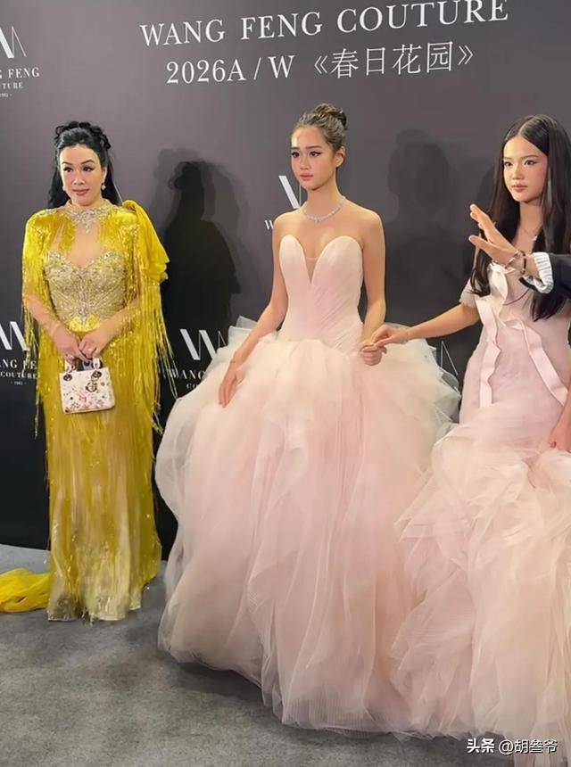 考拉和Jaden姐妹俩则走在中间,都穿了白色打底搭配粉色系礼服,考拉扎着清爽的丸子头,穿粉色抹胸拖尾长裙,少女感十足。