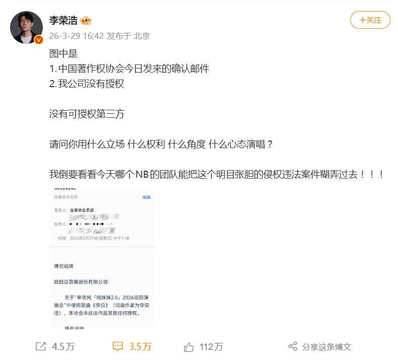 3月29日,14点42分,李荣浩发出4连质问:请问你用什么立场,什么权利,什么角度,什么心态演唱?我倒要看看今天哪个团队能把这个明目张胆的侵权违法案件糊弄过去!