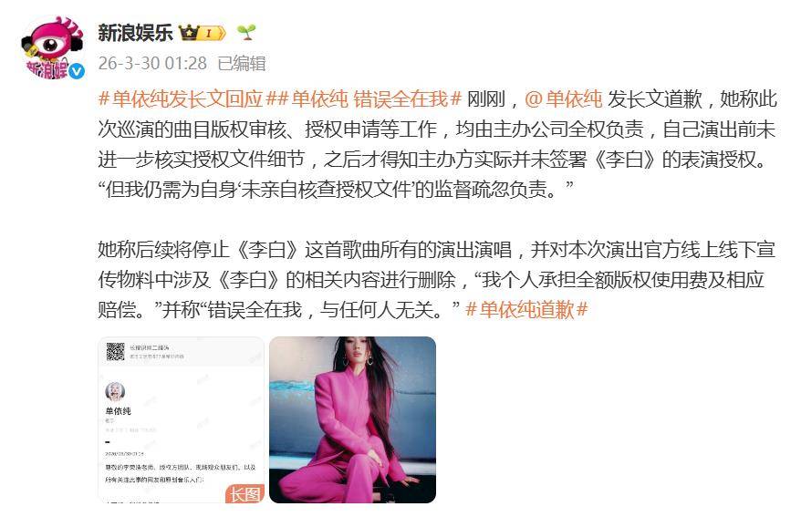 事件起因是单依纯在巡演中演唱了李荣浩的经典作品《李白》,但事后被证实并未获得正式授权。在长文中,单依纯没有将问题推给主办方,尽管她明确说明“曲目版权审核、授权申请等工作,均由主办公司全权负责”,自己也因信任而未在演出前二次核查文件。但她紧接着强调,得知主办方实际未签署授权后,自己必须为“未亲自核查授权文件”的监督疏忽负责。