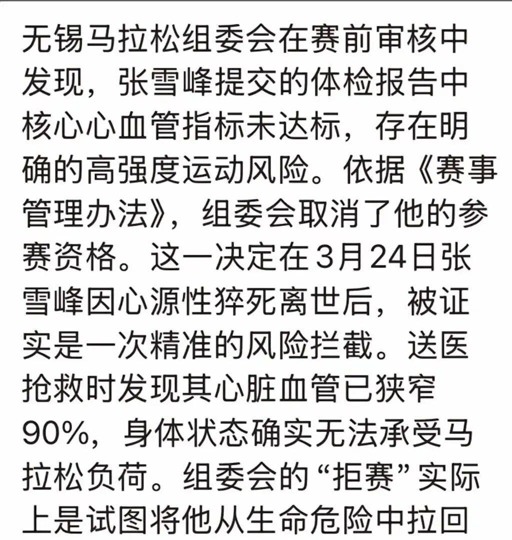 但细心的跑友发现一件事:他报名了无锡马拉松,赛前体检报告显示心脏相关指标不符合参赛要求,组委会正式取消了他的参赛名额。