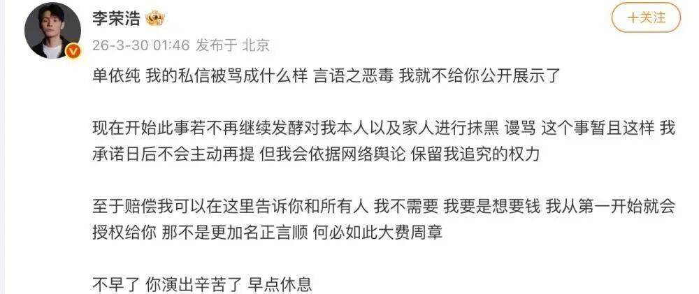 事件发酵速度堪称光速。3月29日下午,李荣浩率先在微博发声,直接喊话单依纯,明确表示自己一方早已婉拒了对方的翻唱及改编授权,可单依纯依旧我行我素,在演唱会上擅自改编并表演《李白》,言语间满是对原创版权的捍卫,也藏着被冒犯的怒火。