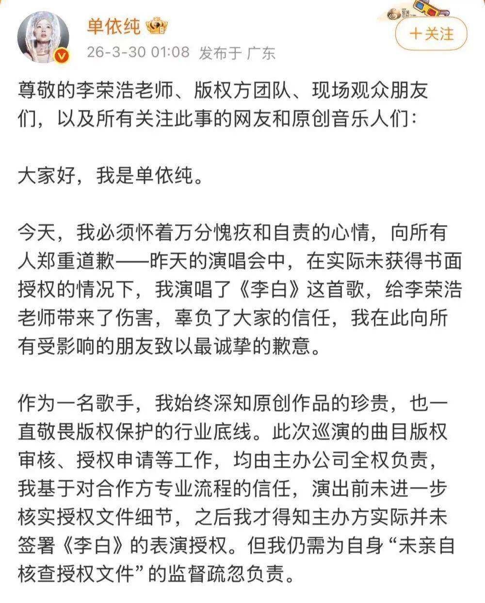 3月29日,内娱乐坛突发一场版权风波,直接霸榜全网热搜——实力派歌手单依纯,在个人商业演唱会上未经授权,擅自演唱李荣浩的经典作品《李白》,被原唱李荣浩公开“指控”强行侵权,语气里满是不满与质问,一场歌手之间的版权之争,瞬间引爆舆论场。