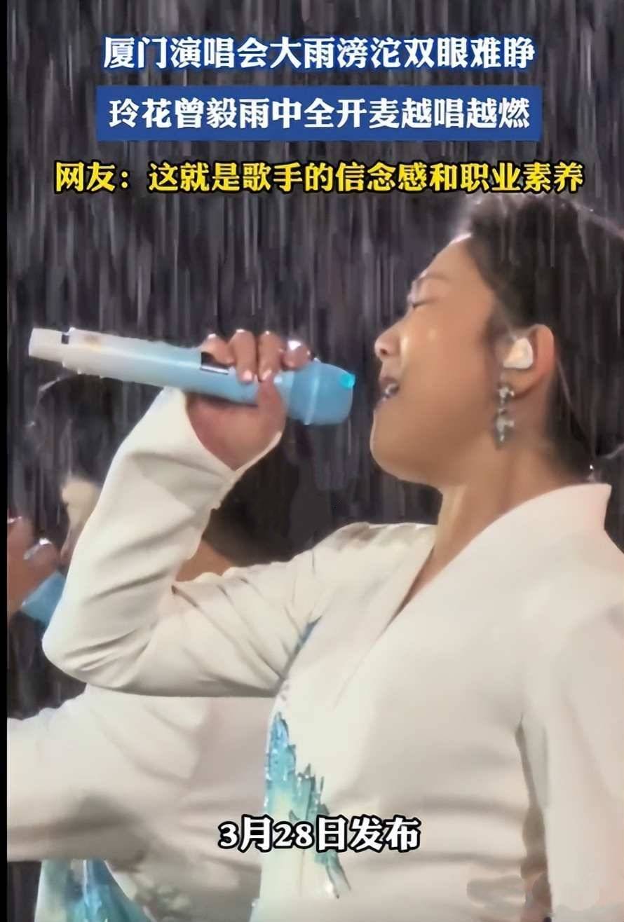 三月二十八号晚上,厦门白鹭体育场外面下着大雨,凤凰传奇的演唱会还是照常举行,内场的观众全都淋湿了,玲花和曾毅的衣服也贴在身上,雨水糊住了眼睛,但他们一直站在台上唱完整场,没