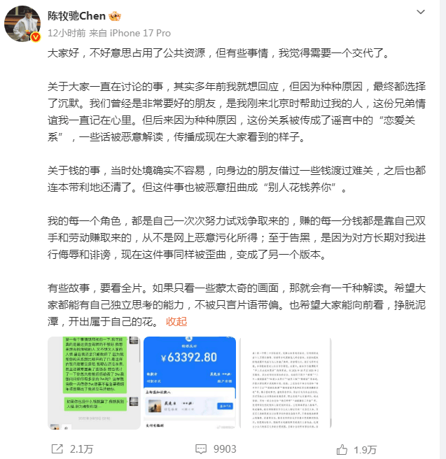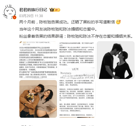 目前,所谓"陈牧驰前妻回应"账号无实名认证,并无本人确认,传播可能对素人造成二次伤害!大家需以权威信息为准,避免片面解读。