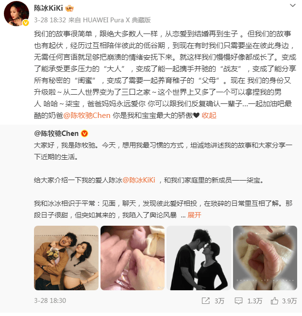 2026年3月28日,演员陈牧驰与歌手陈冰正式官宣结婚并育有一子“柒宝”,两人同步发布长文回顾相恋历程,网传其前妻罗晨通过社交账号以三条极具讽刺性的标题,引发热议!陈