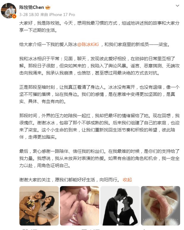 2026年3月28日,演员陈牧驰与歌手陈冰正式官宣结婚并育有一子“柒宝”,两人同步发布长文回顾相恋历程,网传其前妻罗晨通过社交账号以三条极具讽刺性的标题,引发热议!