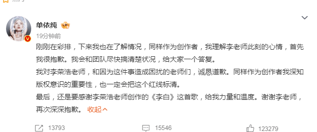 2026年3月29日,单依纯就深圳演唱会未经授权翻唱李荣浩歌曲《李白》一事公开道歉,承认版权意识重要性并承诺与团队核查事件。李荣浩在3月29日14:37发布的声明中指出:单依纯团队