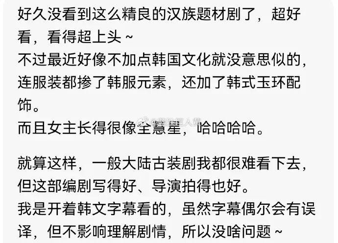 韩国观众称赞《逐玉》是“屠户女×落难侯爷”的反套路人设、电影级东方美学画面,还大赞田曦薇长得漂亮,编剧和导演都不错。