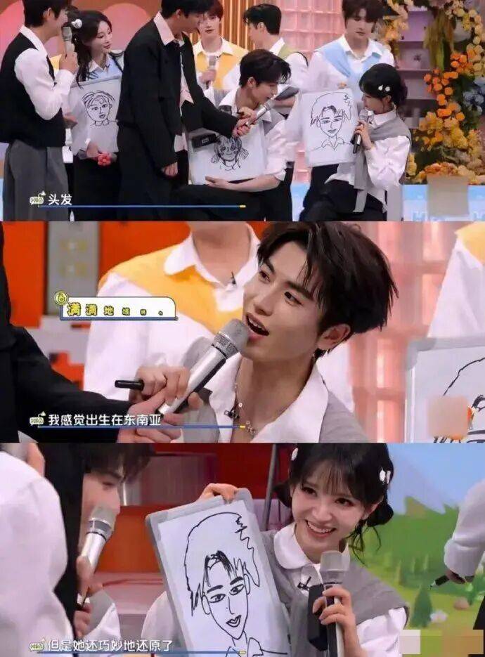 在《你好星期六》画画游戏环节,《逐玉》女主角田曦薇为张凌赫画了一幅抽象肖像,他即兴调侃:“我感觉画里的人出生在东南亚”,并补充 “像杨迪”。
