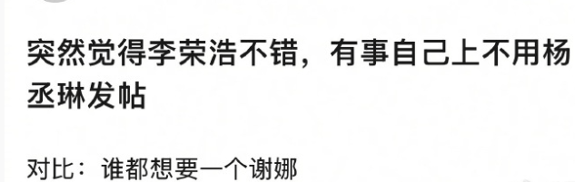 张杰属实有点无辜,没有创作权纠纷,结果却因为李荣浩自己维权,没让妻子杨丞琳出面喊话,而谢娜之前帮张杰吐槽薛之谦维权,显得不够爷们,又被质疑靠老婆。所以这次李荣浩维权,张杰谢娜躺枪,有点搞笑。