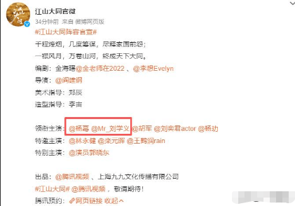近日,历史正剧《江山大同》正式官宣了主演阵容,演员表上明明白白写着,男女主分别是刘学义和杨幂。