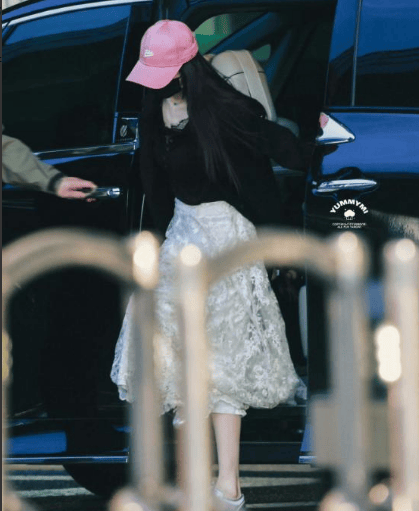 照片里的她,上半身穿着黑色长袖,下半身搭配白色蕾丝裙,脸上戴着黑色口罩,头上还顶了一顶格外显眼的粉色帽子。下车的时候动作轻盈欢快,浑身上下都透着松弛感,完全看不出是快 40 岁的人。