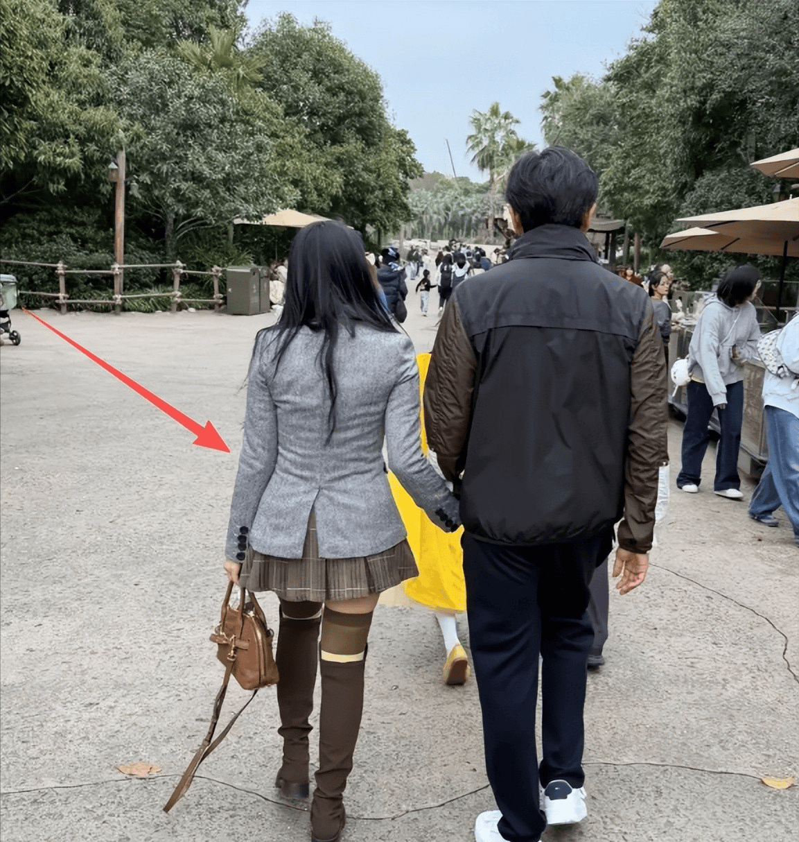 灰色短西装外套,棕色百褶短裙,过膝长靴,再加一个棕色包。背影一拉远,确实有种“还在上学”的错觉,头发又黑又亮,发量也顶,走路带点弹。