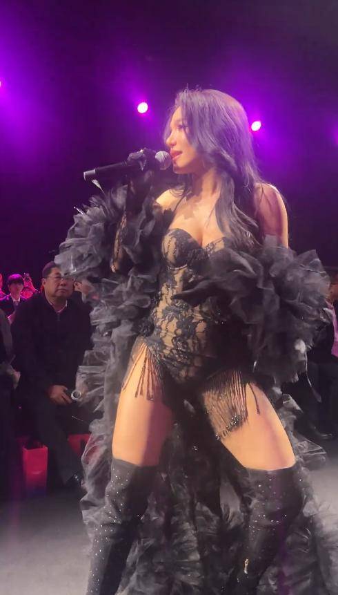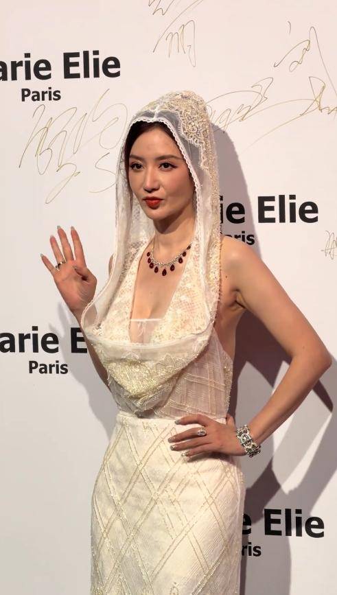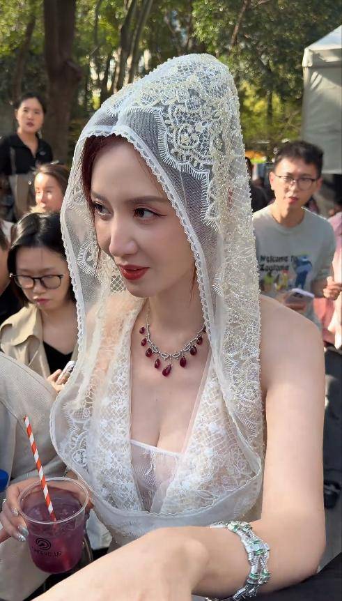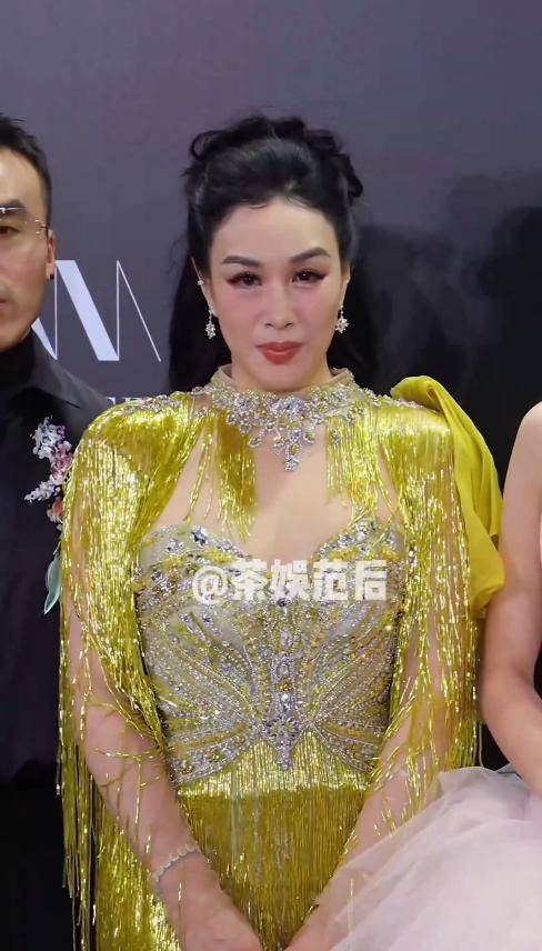 钟丽缇这次的穿搭比以往低调了不少,却依旧难掩风情。她穿着一件宽松的网纱长裙,颜色清新柔和,衬得她气质温婉。
