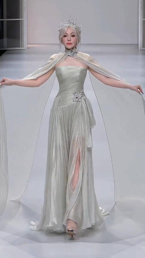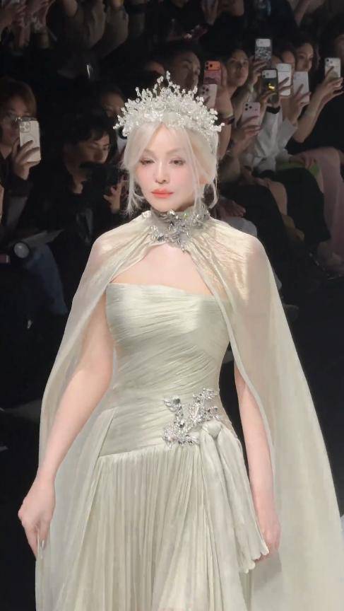 冷冽的白发搭配清新的绿裙,反差感拉满,往那里一站,就自带强大气场,活脱脱现实版的冰雪女王,谁看了都得夸一句状态绝佳。