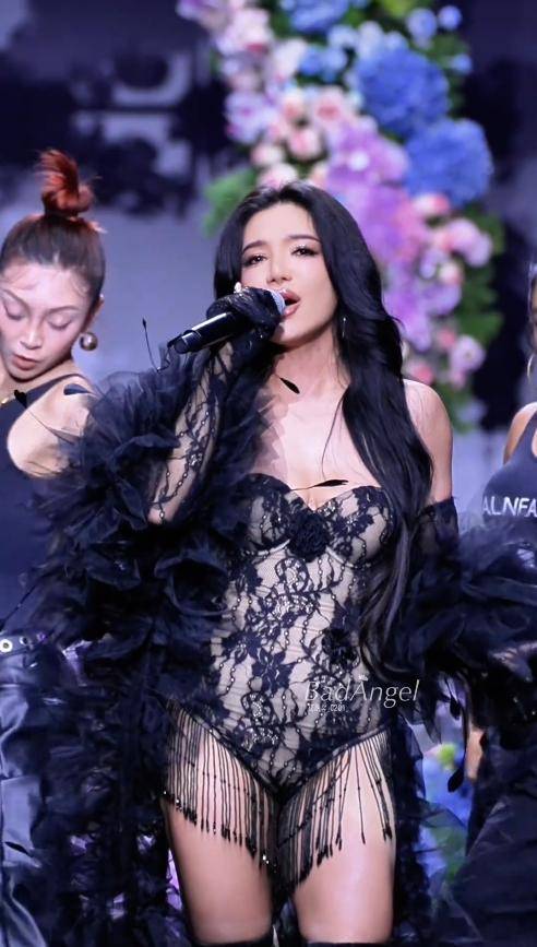 她身着一袭黑色质感紧身裙,外搭同色廓型披肩,着色低调却不普通。