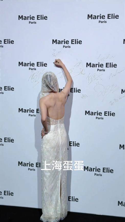 她穿着一袭白色透视露背蕾丝礼裙,轻盈的网纱搭配精致的蕾丝,大露背设计勾勒出紧实的肩背线条,深V设计大方不艳俗。