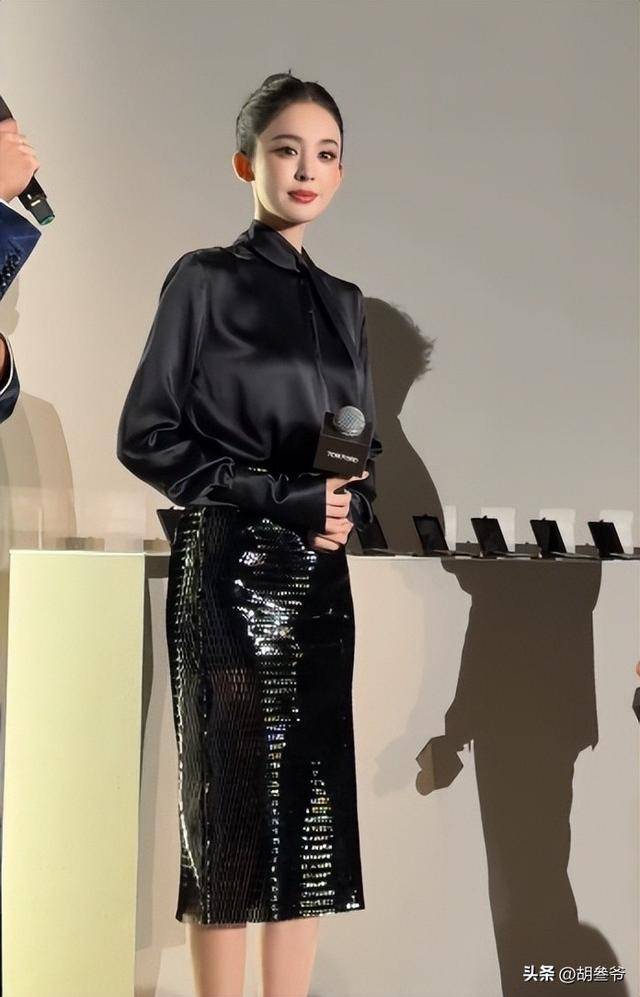 娜扎当天的造型走的是极简黑调路线,黑丝绒衬衫搭配亮片包臀裙,利落的高丸子头配上凌厉的大红唇,单看精修图,高级感直接拉满。