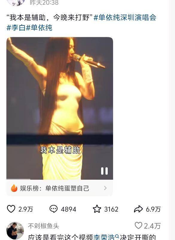 有网友晒出单依纯昨天《李白》的演出视频,确实不太符合主流审美,有点像蹦迪舞曲,穿着打扮清凉,动作也摇头晃脑。