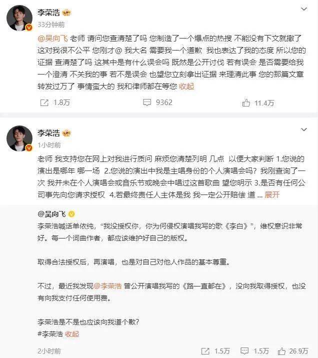 28日,李荣浩再次发文回应吴向飞质疑其侵权唱歌一事,他询问吴向飞有没有查清楚,“您制造了一个爆点的热搜,不能没有下文就撤了,这对我很不公平” ,他说若有误会,是否需要给自己一个澄清,若不是误会,也望吴向飞能立刻拿出证据来理清此事,“您的那篇文章转发过万了,事情蛮大的,我和律师都在等您”。