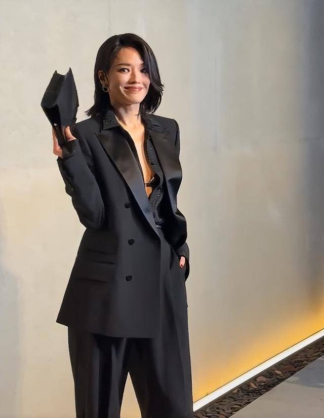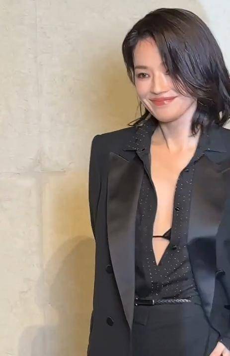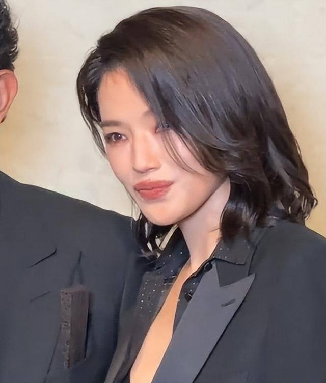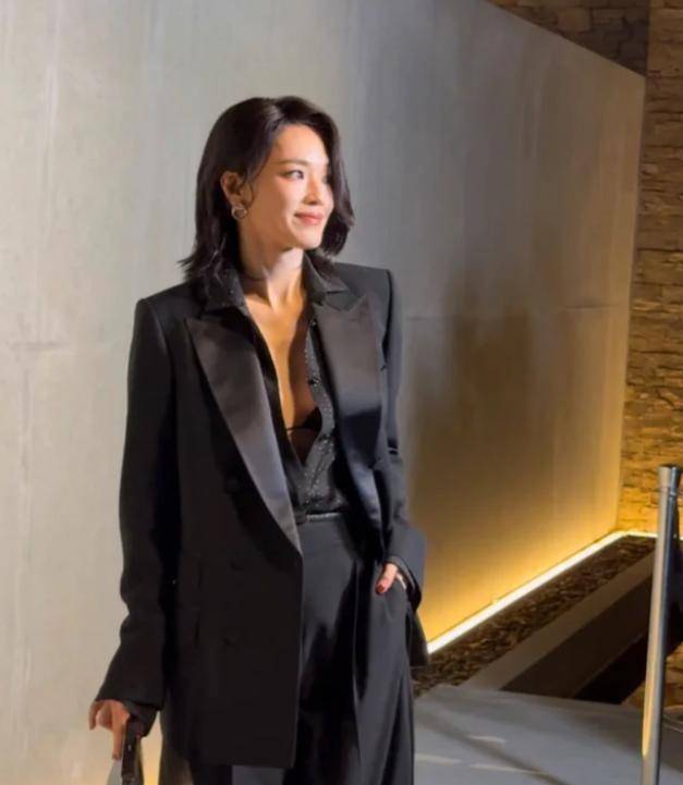 她穿了一身黑色西装,没有刻意扣上扣子,敞开的领口露出内衣,自带一种慵懒又风情的气场,偏分慵懒短发随意搭在肩头,搭配简单的珠宝点缀,没有多余的装饰,却把“高级感”三个字焊在了身上。