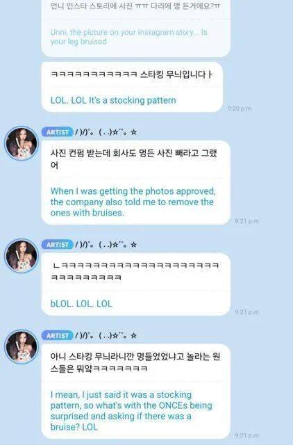 面对粉丝“欧尼,你Ins上的照片…腿上是淤青吗?”的提问,娜琏哭笑不得地回应:“哈哈哈那是丝袜的花纹啦。”
