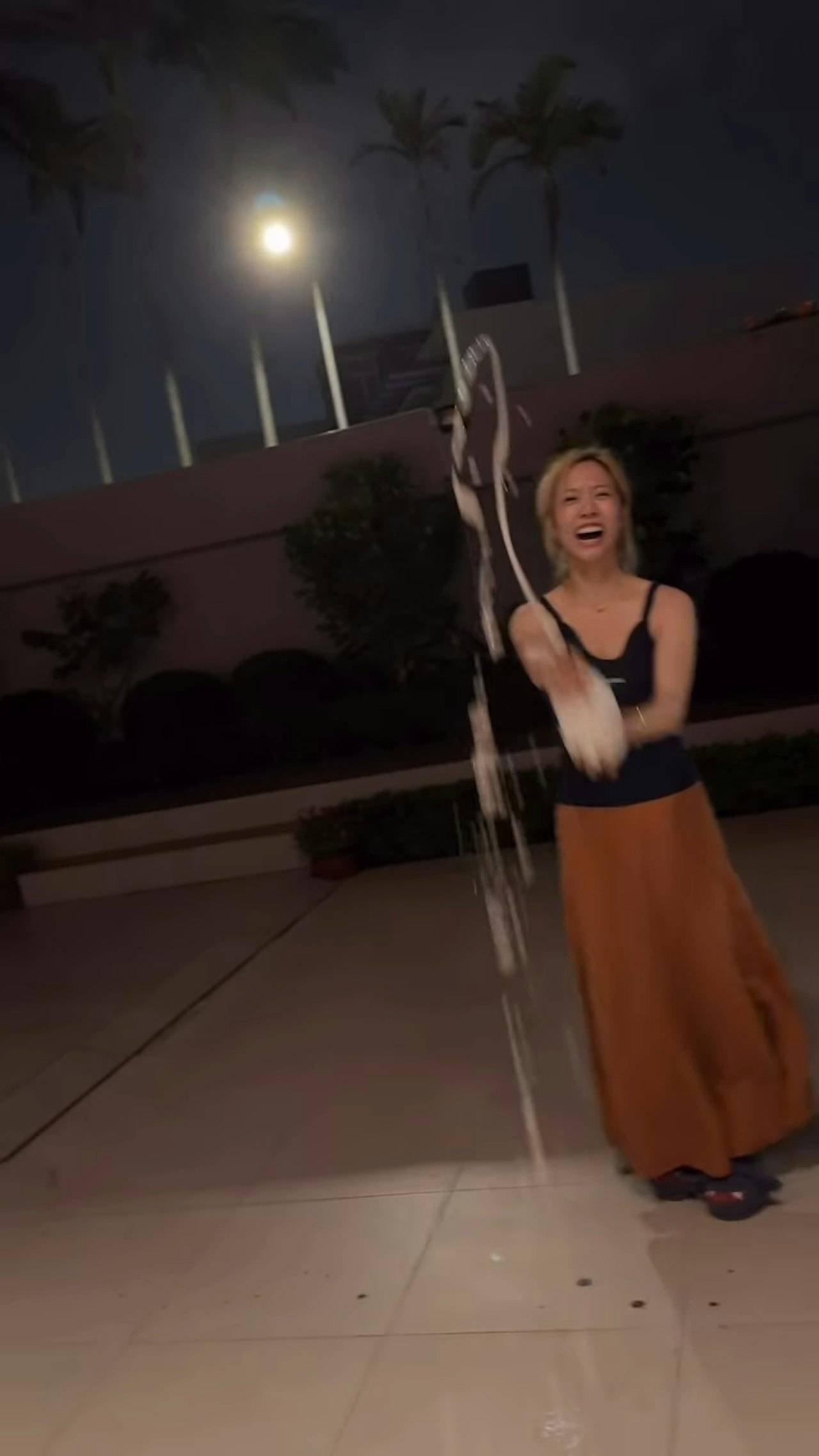 现年32岁的TVB小花胡美贻与林建岳长子林孝贤前几年被曝光低调交往,而胡美贻对此一直避谈。不过通过蛛丝马迹证实,胡美贻不只是仍然与林孝贤保持交往的关系,还被曝光已经搬入了林孝贤与母亲谢玲玲一起居住的位于九龙塘的四亿独立屋生活。胡美贻迎来32岁生日,她在社交平台上晒出庆祝的照片,现场并没有很多人,实际上就只有她一人拿着香槟在庭院摇晃喷洒庆祝,非常开心。