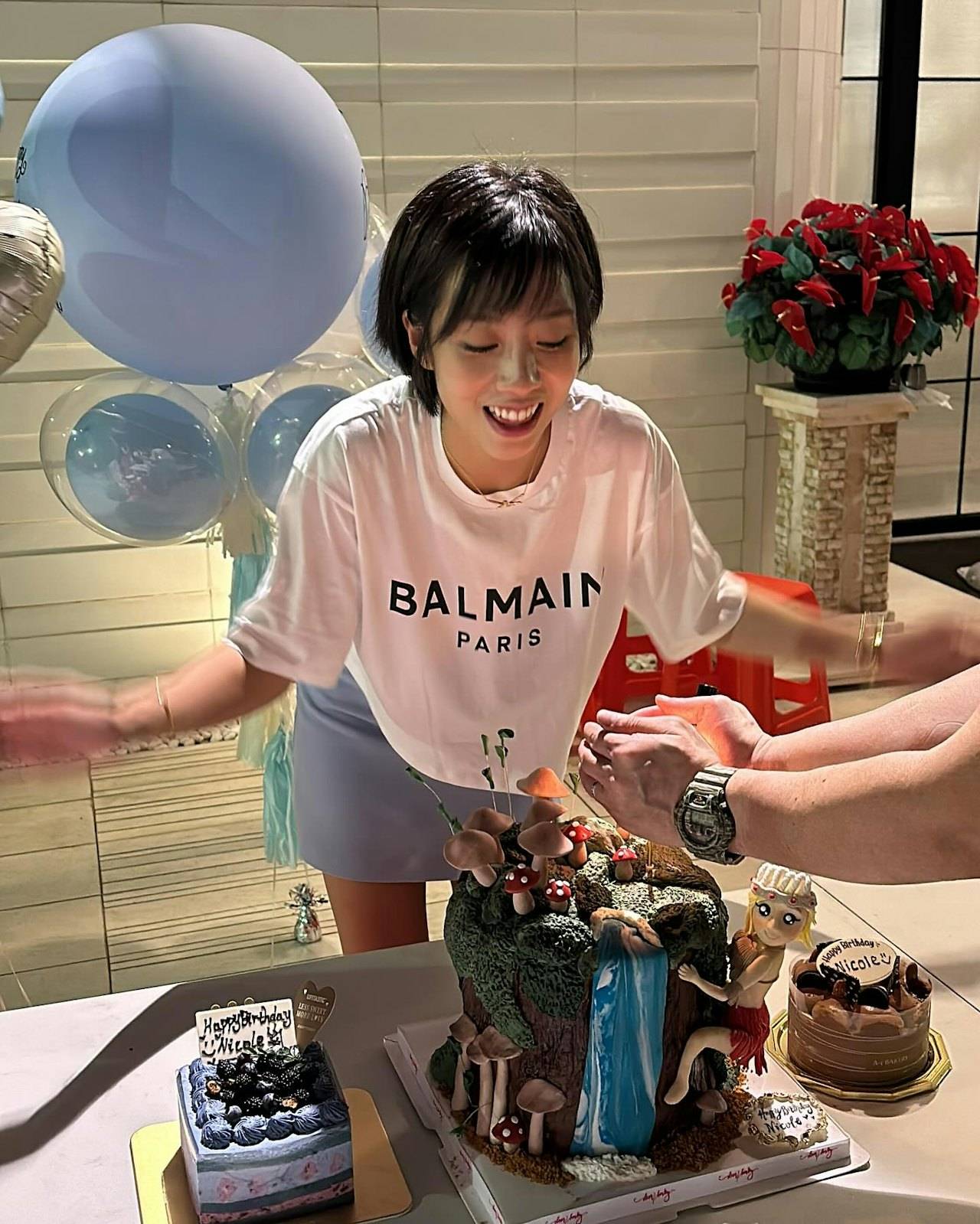 胡美贻此次庆生的地点之所以会被发现是林孝贤的独立屋,那也还因为在几年前,胡美贻曾经在同一个独立屋的庭院开过庆生派对。当时还办得颇为隆重,庭院还被布置了一番,放上了蓝色的气球,而胡美贻也身穿蓝色短裙现身,对比起如今她晒出庆祝32岁的照片,地板砖一模一样。胡美贻还不只是在大宅庆生那么简单,根本就已经搬了进来,她过去不时在社交平台上晒出生活照,偶尔曝光豪宅内部结构,这与谢玲玲晒出的豪宅格局很相似,最显著的特征就是大厅与会客厅有一层楼梯衔接——如果她不是在此入住,也没理由三天两头在此拍生活照。