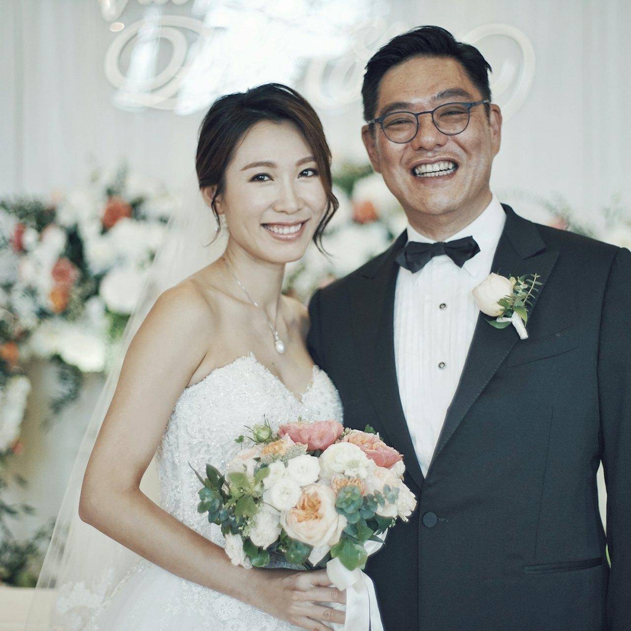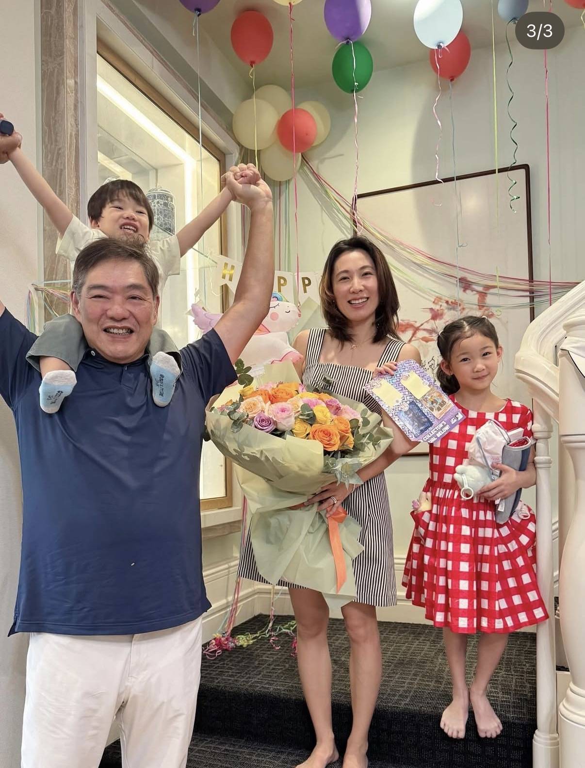 除了夫妻合照,少不了的还有一家四口的合照,李美慧换了一套黑白相间的吊带裙现身,依然捧着曾文豪送的花,在她旁边的是打扮得美美的7岁女儿,女儿穿了红白格纹长裙,手上还拿着送给妈妈的礼物。曾文豪在另一边与儿子一起,他把两岁的儿子架在自己的肩膀上,举着儿子的手,由于父子俩的年纪相差太大了,这温馨的一幕看起来像爷孙多于像父子。感受得到曾文豪对儿子的疼爱,毕竟老来得子不容易。