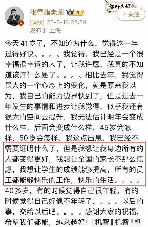 翻看张雪峰的账号,他在去年5月18日过生日时曾说,他是一个很幸福很幸运的人,他希望让身边所有的人都变得更好,让全国的家长都不那么焦虑,让学生的成绩都能够提高,让所有的员工都能快乐工作、快乐生活,真就是责任心好强啊。