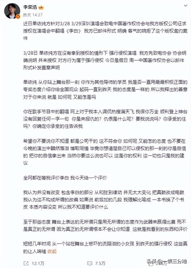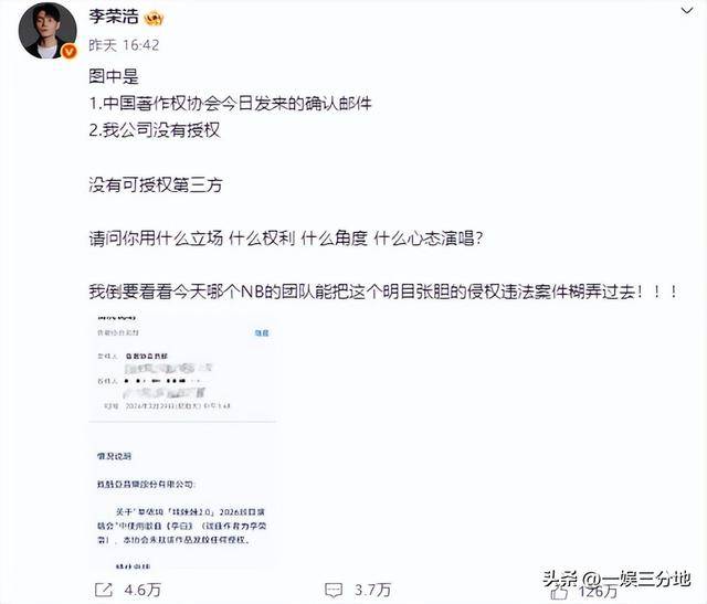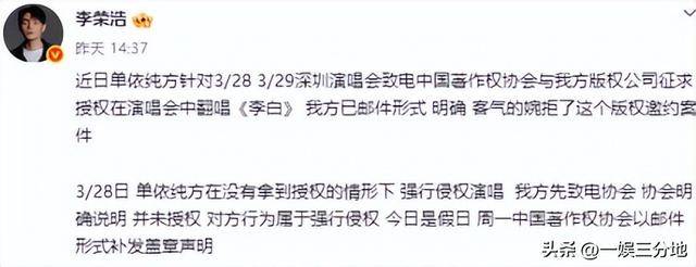 而李荣浩在前几个小时才发了中国著作权协会的邮件,声明自己没有授权。