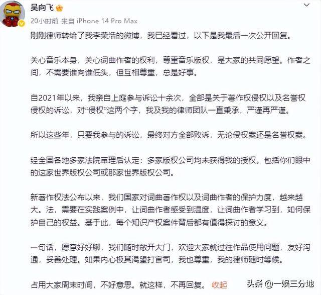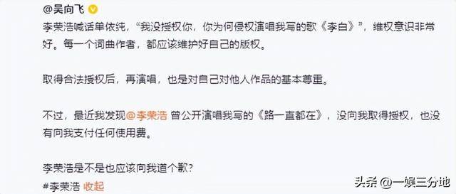 不过事情还没结束,就有了一个小插曲,一名叫吴向飞的创作人,出来发文说李荣浩之前唱自己写的歌是侵权。