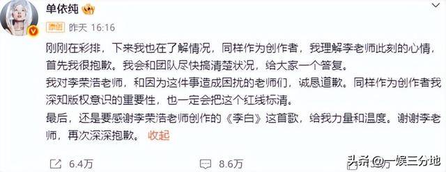 在当天的演唱会结束后,李荣浩发了一篇小作文,说单依纯在演唱会上唱《李白》并没有获得自己的授权。