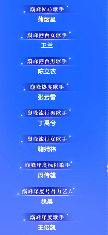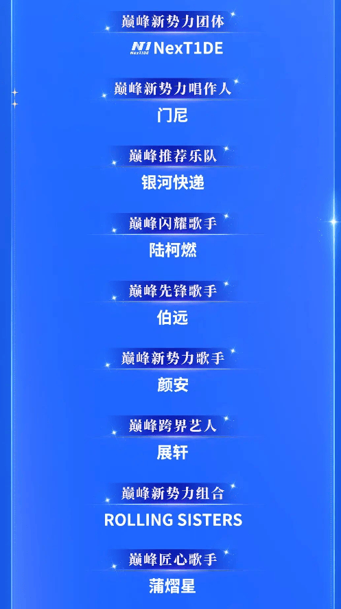 先来看看这份奖项名单,堪称中文词汇的极限挑战。巅峰新锐、巅峰潜力、巅峰飞跃、巅峰风尚、巅峰榜样、巅峰瞩目、巅峰进取、巅峰品质、巅峰口碑、巅峰潮流、巅峰传唱力、巅峰实力、巅峰荣耀、巅峰卓越、巅峰影响力、巅峰最佳……光是“巅峰”二字的前缀,就凑出了一本形容词大全。