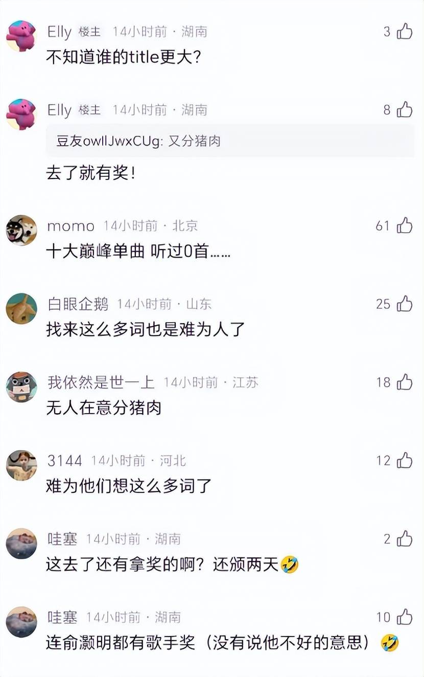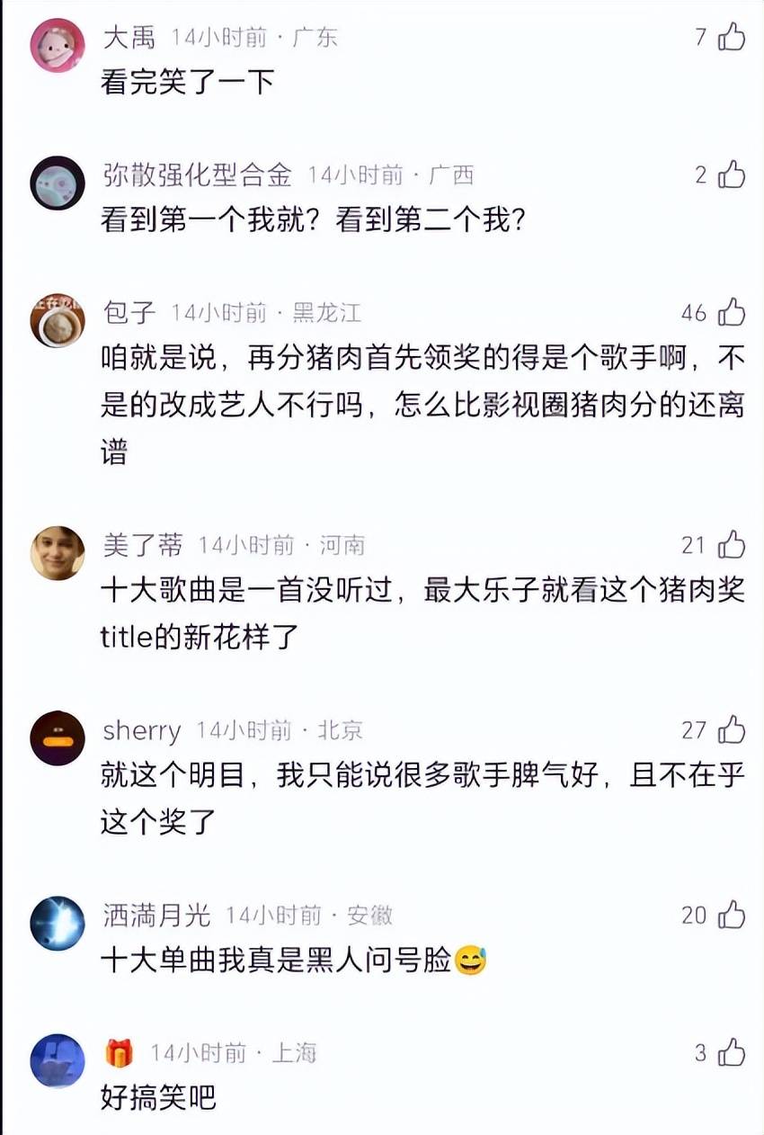 有网友说得直接:“咱就是说,再分猪肉首先领奖的得是个歌手啊,不是的改成艺人不行吗,怎么比影视圈猪肉分的还离谱。”