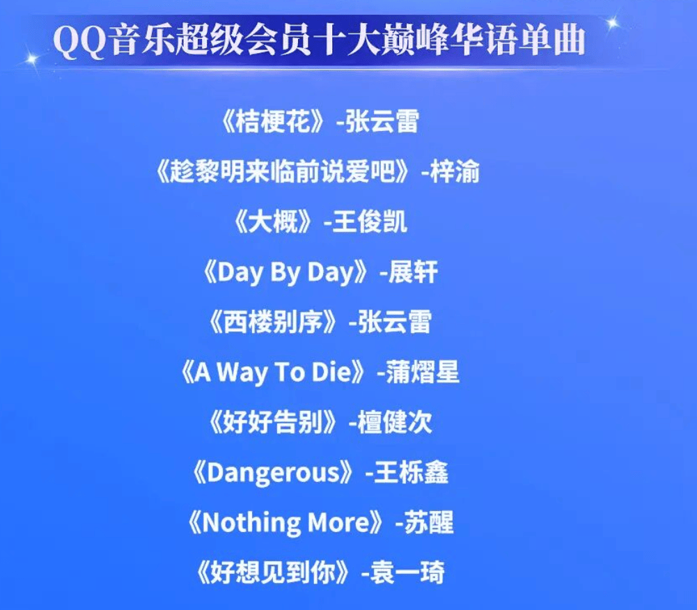 再看那所谓的“十大巅峰单曲”,有张云雷的《桔梗花》《西楼别序》、梓渝的《趁黎明来临前说爱吧》、王俊凯的《大概》、展轩的《Day By Day》、蒲熠星的《A Way To Die》、檀健次的《好好告别》、王栎鑫的《Dangerous》、苏醒的《Nothing More》、袁一琦的《好想见到你》。