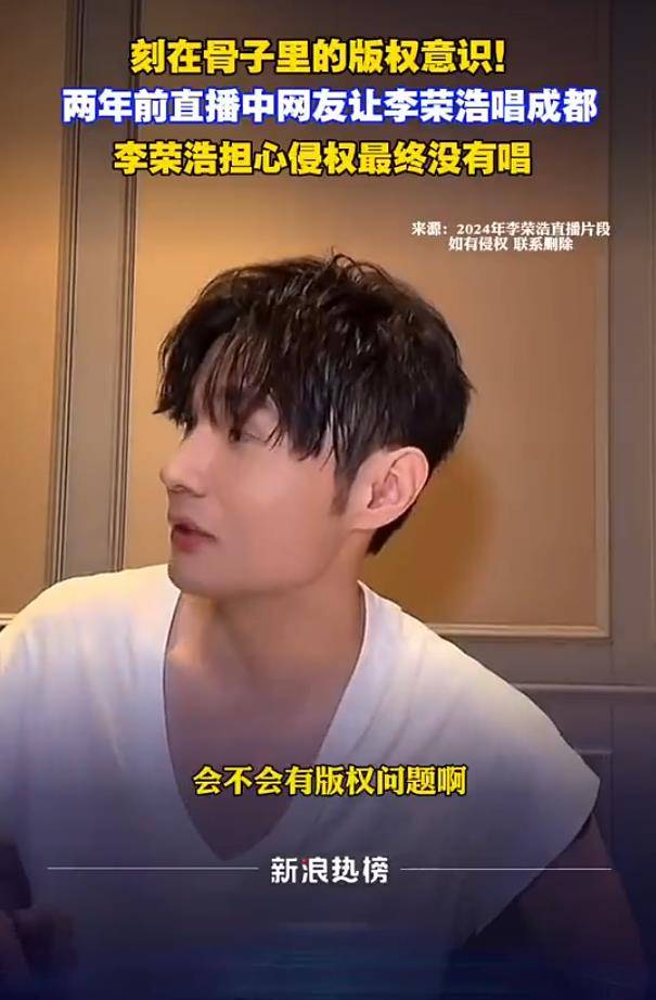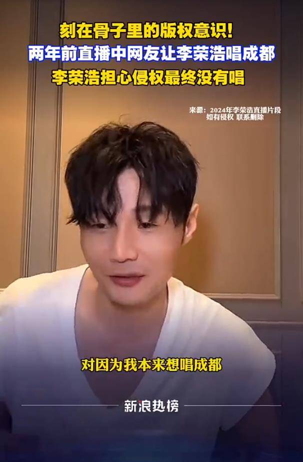 时间回到2024年的一次直播。当时,面对粉丝点唱赵雷的《成都》的请求,李荣浩没有立即满足,而是第一时间追问工作人员:“这个我们能播吗?有授权吗?”在得到“应该可以播放”的模糊回应后,他并未放松,反而反复质疑其合法性。在确认无法获得明确授权后,他毫不犹豫地秒速叫停了即将响起的伴奏,最终放弃了演唱。这一幕,被网友评价为“把谨慎写在了脸上”。