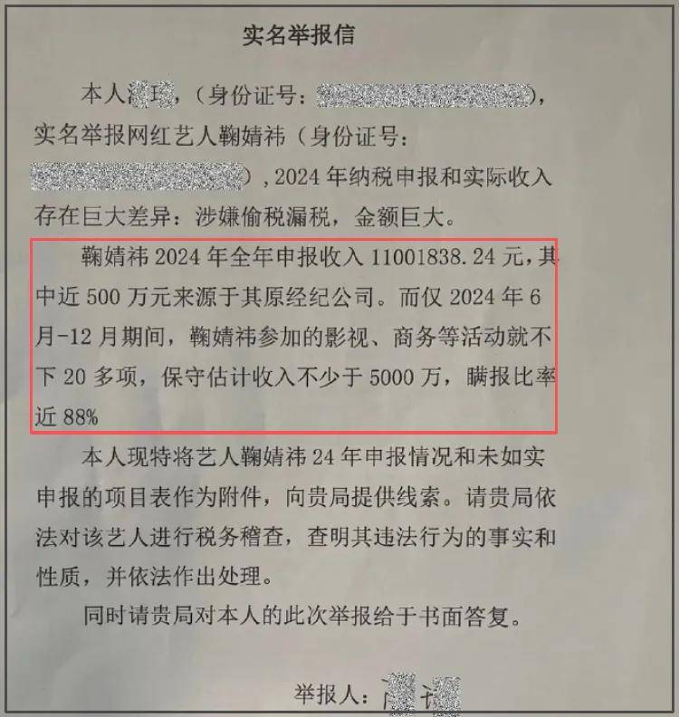 举报材料显示,鞠婧祎2024年全年申报收入约1100万元,其中申报收入近500万元来自丝芭传媒,其余约600万元来自其他渠道。举报人列举了2024年6月至12月的收入情况,指出鞠婧祎参加影视、商务等活动约20项,估算收入不低于5000万,瞒报比例近88%。
