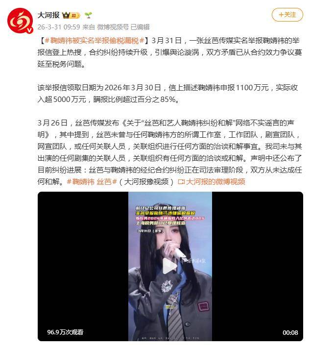 据3月31日报道,一张实名举报信截图,将艺人鞠婧祎与其经纪公司丝芭传媒的长期合约纠纷,彻底推向了新的风暴眼。双方围绕一纸合约的争执,已从法庭上的笔迹鉴定,升级为指向“偷税漏税”的严峻指控,瞬间引爆网络。