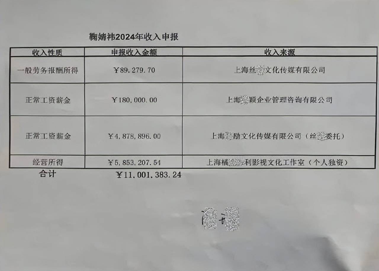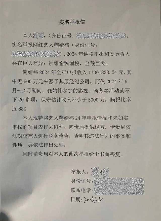 这场风暴的导火索,是一份领取日期为2026年3月30日的实名举报材料。材料中指控,鞠婧祎在2024年存在巨额收入瞒报行为:其全年申报收入仅为1100.18万元,但仅2024年6月至12月这半年多时间,其影视、商务等活动的实际收入保守估计就超过5000万元,瞒报比例高达近88%。举报人不仅提供了收入申报表,还附上了未申报项目的具体明细作为证据。