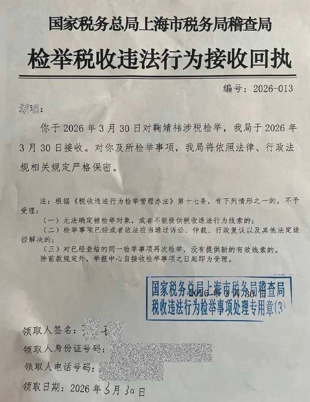 国家税务总局上海市税务局稽查局随即在3月30日出具了《检举税收违法行为接收回执》(编号:2026-013),正式受理举报并启动了稽查程序。这意味着,争议已从民事纠纷领域,进入了官方税务稽查的视野。