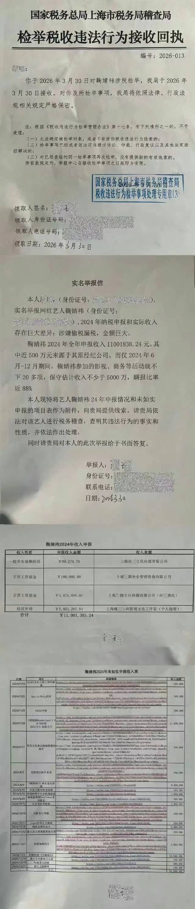 举报内容显示,鞠婧祎在2024年全年申报收入1100.138324万元,其中近500万元来源于其原经纪公司,而仅2024年6月到12月期间,鞠婧祎参加的影视、商务等活动就不下20项,保守估计收入不少于5000万,瞒报比率近88%。