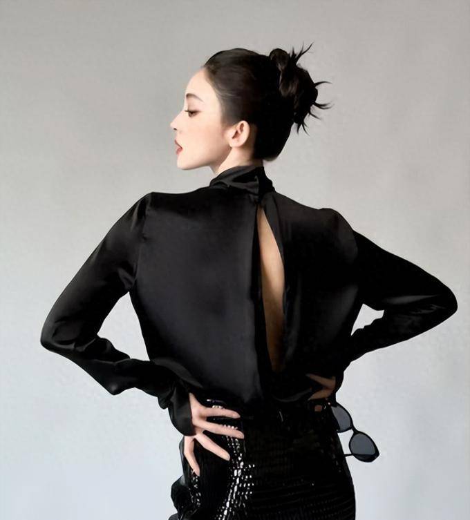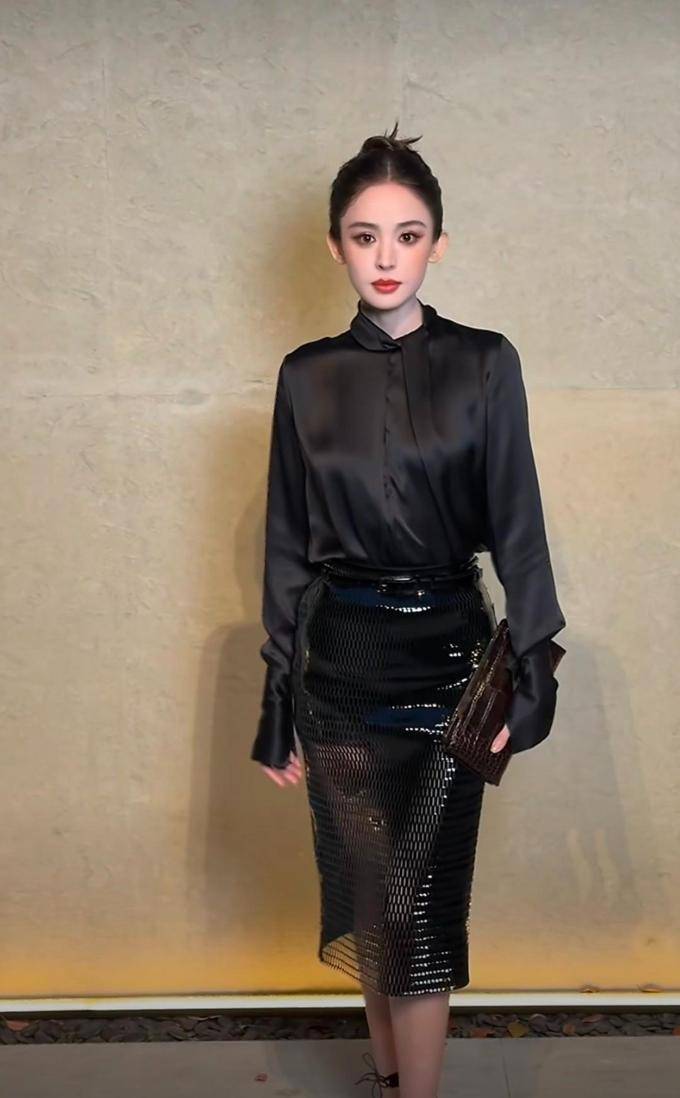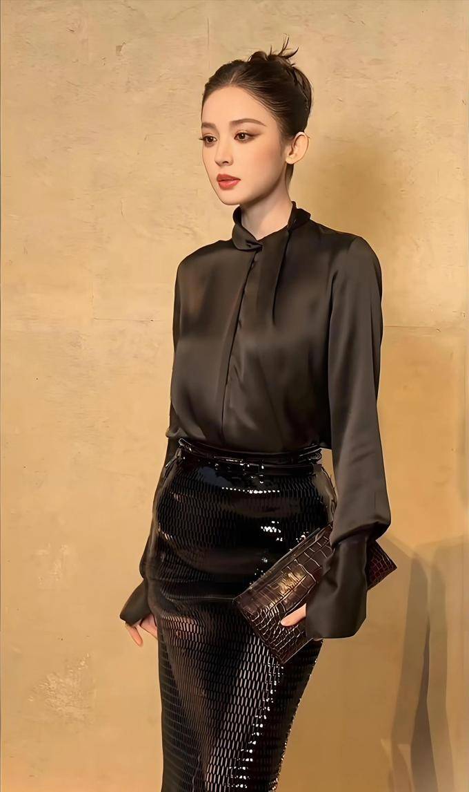 娜扎以一套简洁的全黑色修身商务服装亮相,上身是黑色的立领衬衫,下身则是包臀裙。缎面材质的衬衫与亮面皮质的裙子相搭配,简约而不简单,具有很高的层次感,紧身版型勾画出她的完美曲线。