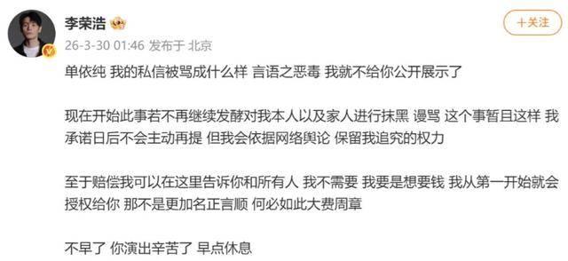 李荣浩随后也回应,说不需要赔偿,只要不再发酵、不抹黑他和家人,这件事就暂且翻篇,但会保留追究责任的权利。