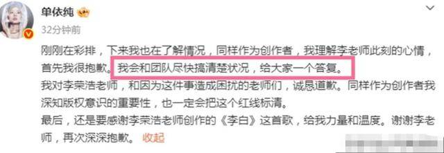 当天下午,单依纯就发文道歉,说自己会和团队核实情况,给大家一个答复。